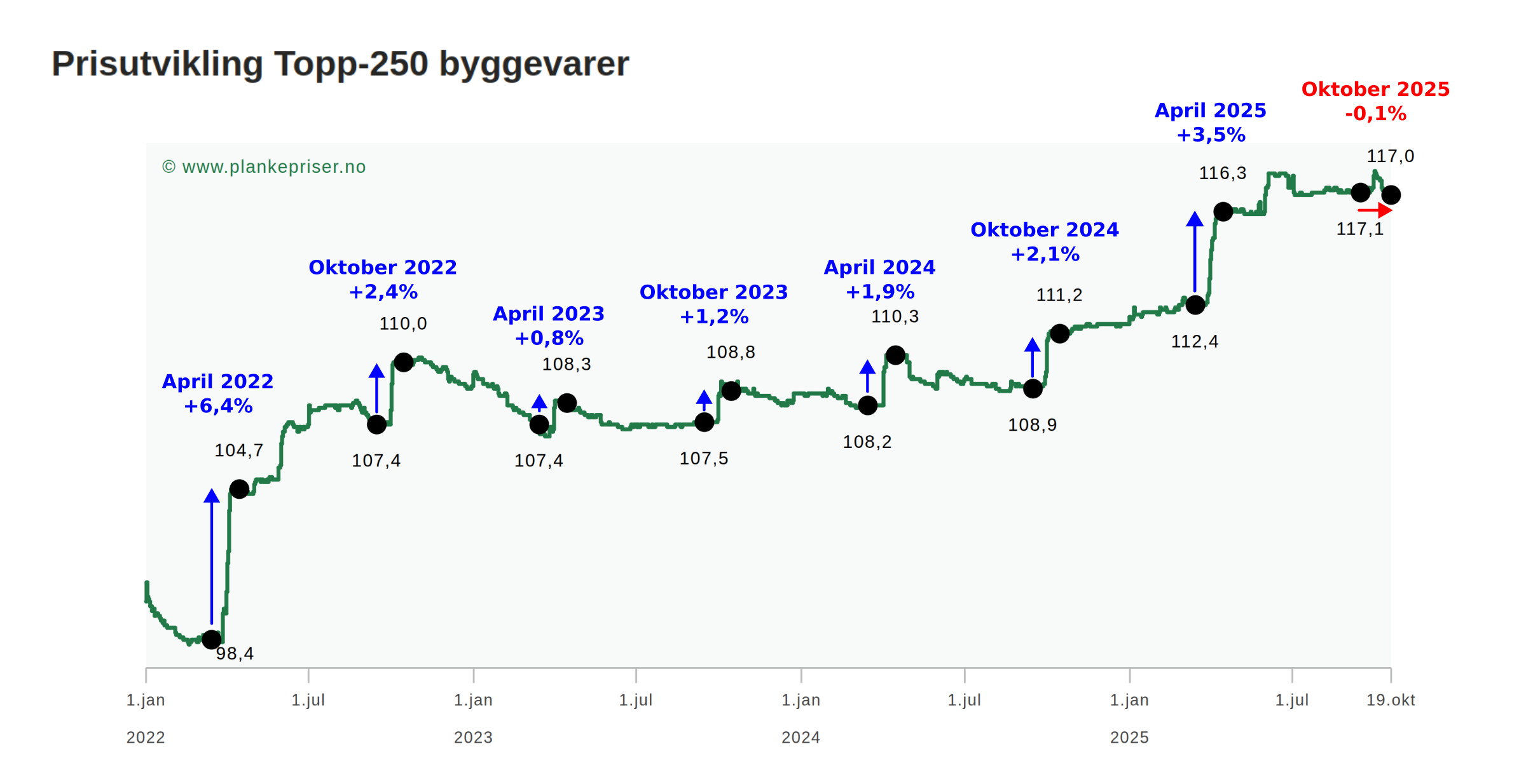 Byggevareprisene - representert med Plankepriser sin topp-250 indeks - er ned 0,1% i den generelle prisjusteringen i oktober. Altså en flat utvikling. Siden 2020 har det vært tydelige og til dels kraftige prisøkninger hver april og oktober. Den flate utviklingen er derfor et tydelig brudd med mønsteret vi har sett de siste fem årene. I graf 1 har vi markert april- og oktober-justeringene fra 2022, så du enkelt kan se hvordan mønsteret har endret seg.
