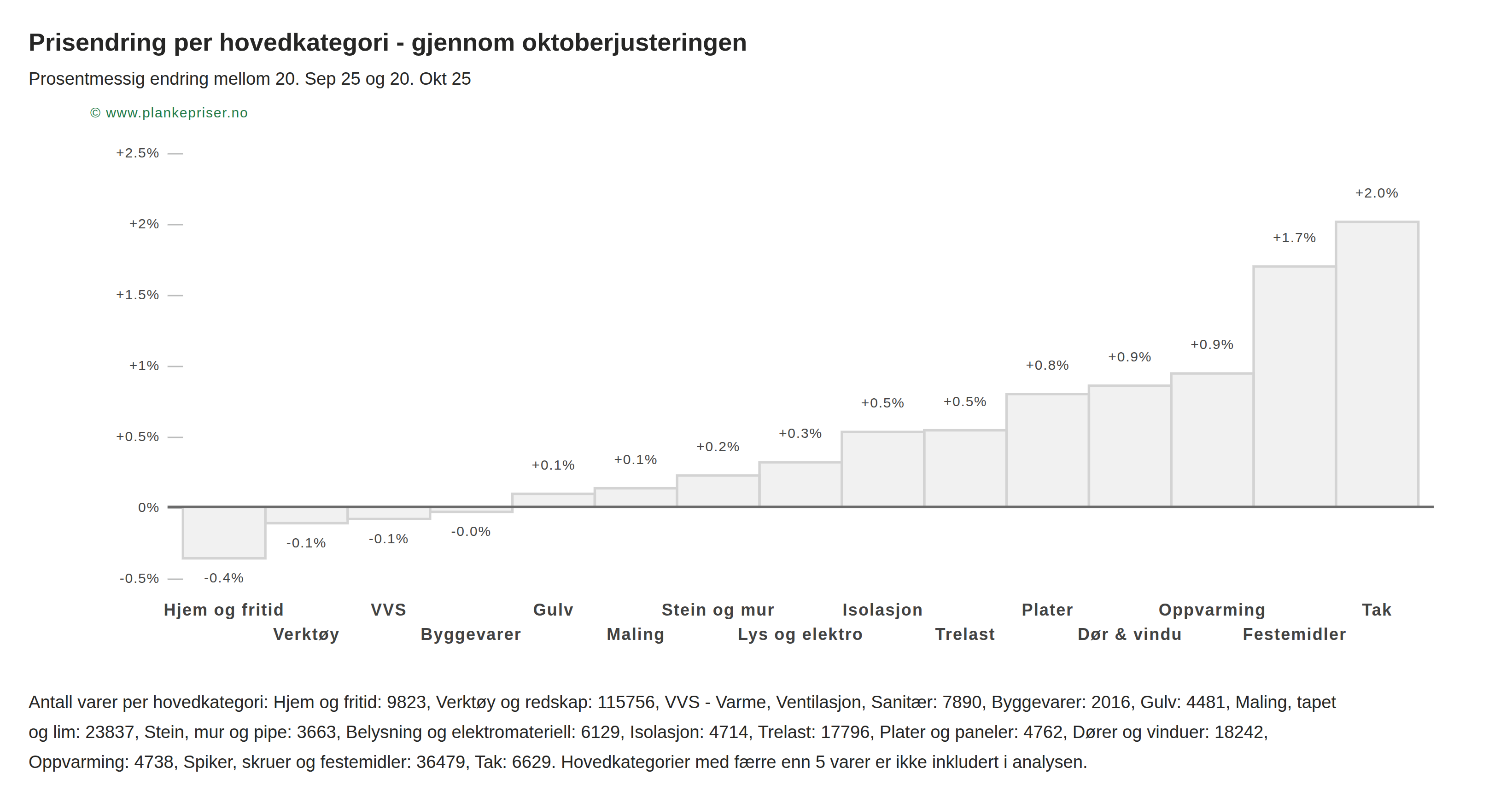 Topp-250 indeksen består av de 250 mest solgte varene, men det er svært mange flere varer i byggevarehandelen. Ved hjelp av AI har vi kategorisert over 200 000 av varene, slik at vi kan analysere prisendringene per hovedgruppe og undergruppe. I graf nr 2 ser vi prisendring siste måned per hovedkategori. Takprodukter øker mest med +2,0%, fulgt av stein/mur med +1,7% og oppvarming med +0,9%.