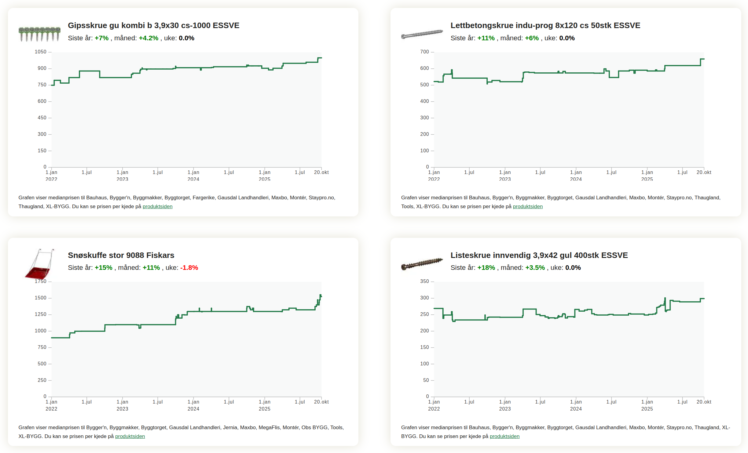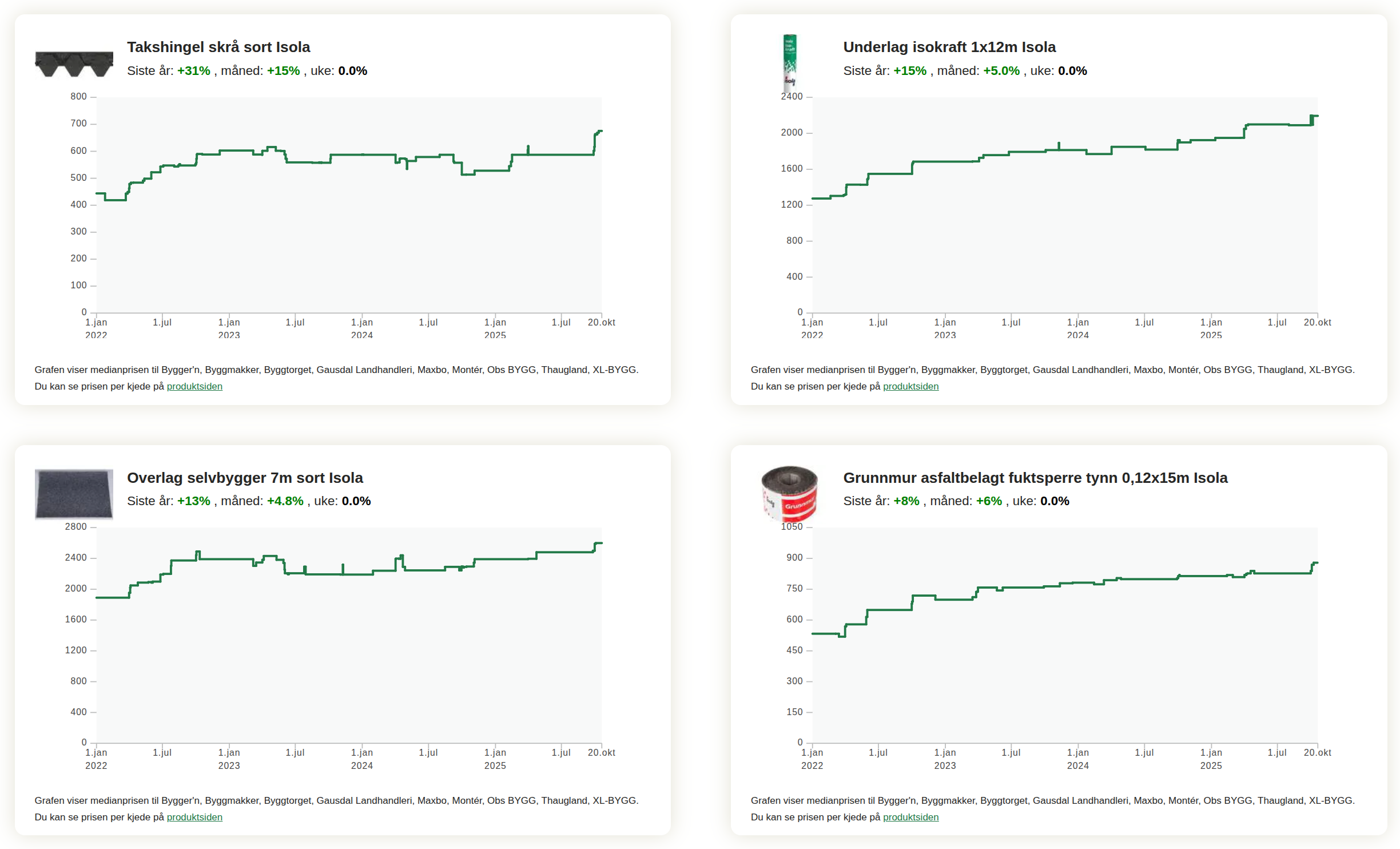 Hvilke produkter er det som trekker opp kategoriene med tak og festemidler? Det er særlig to merkevarer som skiller seg ut, og det er Isola (tak) og ESSVE (festemidler). Under viser vi medianprisen i markedet for noen av produktene deres, hvor vi ser hoppet nå i oktober. Det er ingen dramatikk her, og merkevarene gjør ofte endringer på ulike tidspunkter. Vi trekker de kun frem her for å illustrere at selv om indeksen med topp-250 byggevarer har flat utvikling så er det endringer på en lang rekke enkeltvarer.